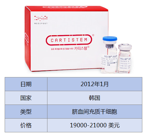 2012 年,韩国 MFDS 批准 Medi-post 公司的 Cartistem,用于治疗膝关节软骨损伤和退行性关节炎。Cartistem 产品包含 1.5ml 脐带血来源的间充质干细胞(7.5×106)和 4% 透明质酸。根据 Cartistem III 期临床研究结果,98% 的患者显示出治疗效果。即使在软骨缺损较大的情况下,也显示出优异的软骨再生效果。特别是已经证实,即使是单次治疗也有良好效果。