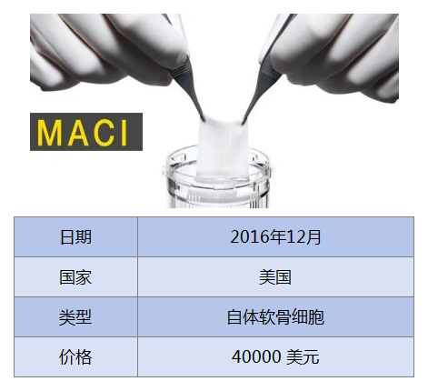 2016 年 12 月,FDA 批准 Vericel 公司的自体软骨细胞药物 Maci,治疗膝关节软骨缺损。Maci 是一种在猪胶原蛋白膜上培养的软骨组织工程产品,它为外科医生提供了一种修复软骨损伤的新工具。2018 年,发表在《The American Journal of Sports Medicine》上的 5年研究 数据显示,对于大于 3cm² 的病变,MACI通常比微骨折有效。40,000 美元的价格,让 MACI 显得昂贵,但美国的保险公司已经采取行动。