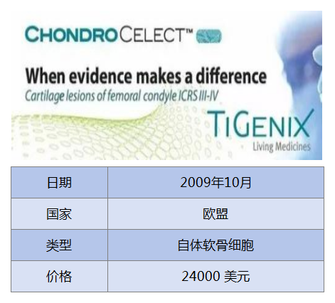 2009 年,欧洲药品管理局(EMA)正式批准比利时 TiGenix 公司研发的 ChondroCelect,标志着 ACI 技术的成熟。ChondroCelect 和 Carticel 都属于第 1 代 ACI 产品。随着时间的推移,临床应用的主要趋势转为第 2 代和第 3 代 ACI 产品。再加上一直未获得欧盟主要国家的报销政策,ChondroCelect 在 2016 年退市。
